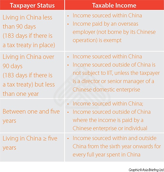 An individual who has resided in China for more than 90 days but less than one year during the tax year is subject to IIT on all China-sourced income, including income paid by both Chinese and overseas entities for his/her work in China. Income earned while working overseas (i.e., foreign-sourced income) in the tax year is not Chinese IIT taxable.