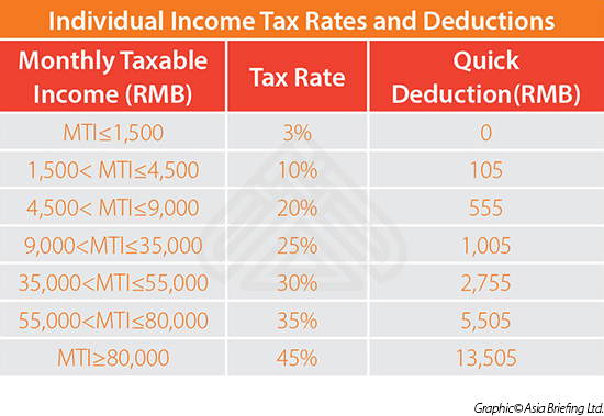 Like in most nations, individual income tax in China is levied at a progressive rate. The tax brackets and corresponding rates are shown below. To avoid the hassle of calculating the different parts of one’s income at different tax rates, the table below includes a Quick Deduction figure. This allows you arrive at the amount of tax payable by entering the full income into the highest applicable tax rate, and then subtracting the Quick Deduction amount.