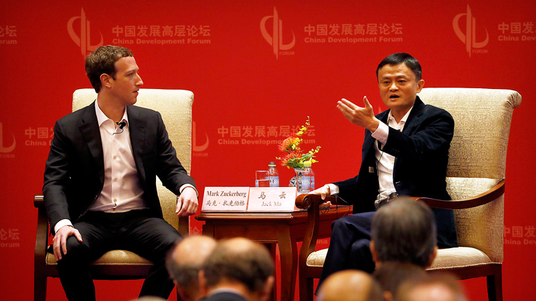 Alibaba Group Holdings's Executive Chairman Jack Ma discussed with Facebook founder and CEO Mark Zuckerberg about innovation at the China Development Forum held in Beijing Saturday.